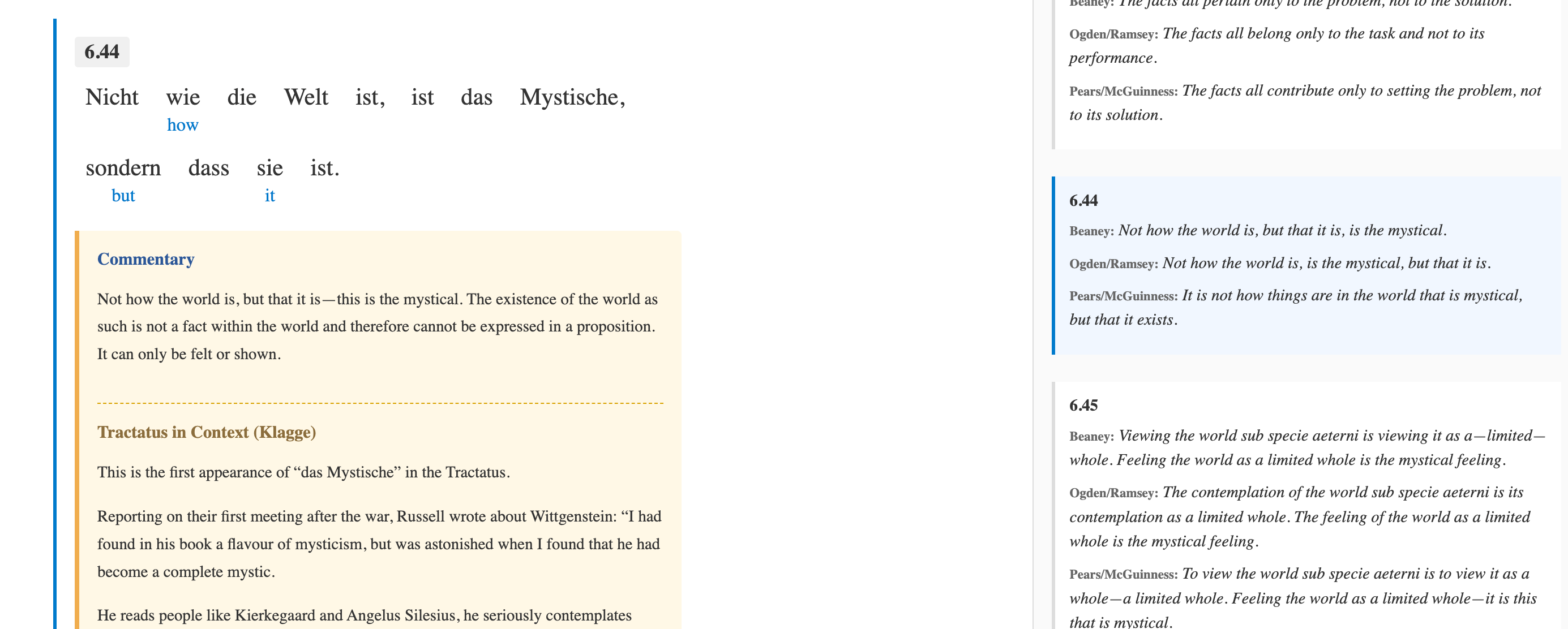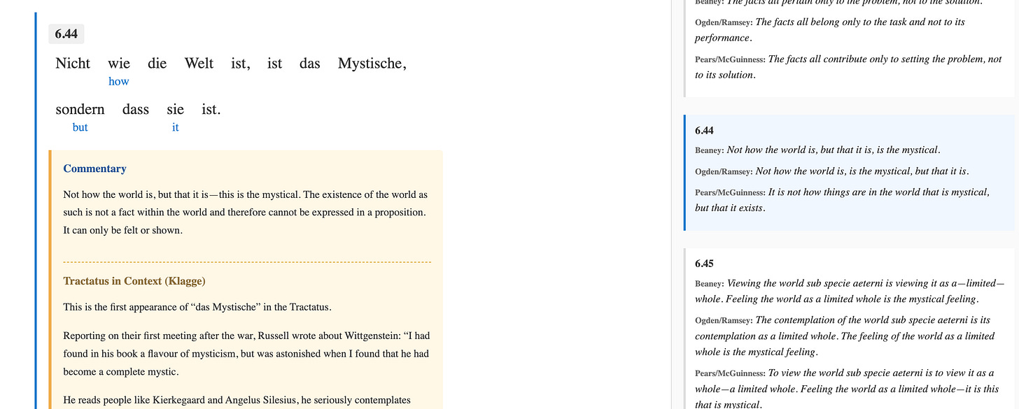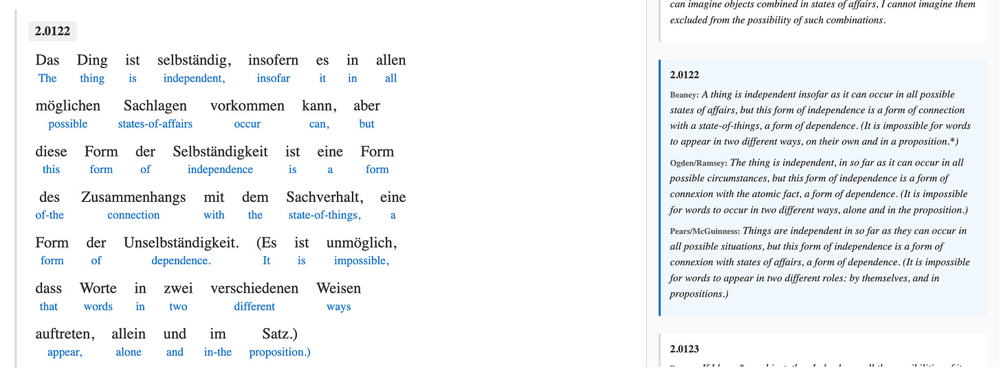 So I used my tool, Gloss, to make an edition with the German text first, so I could gradually become used to Wittgenstein’s style and vocabulary, approaching each proposition on its own term, and slowly learning German through it. And then, on the side I had the three different translations named above. Thus I was reading the words, and all the words derived from them.
